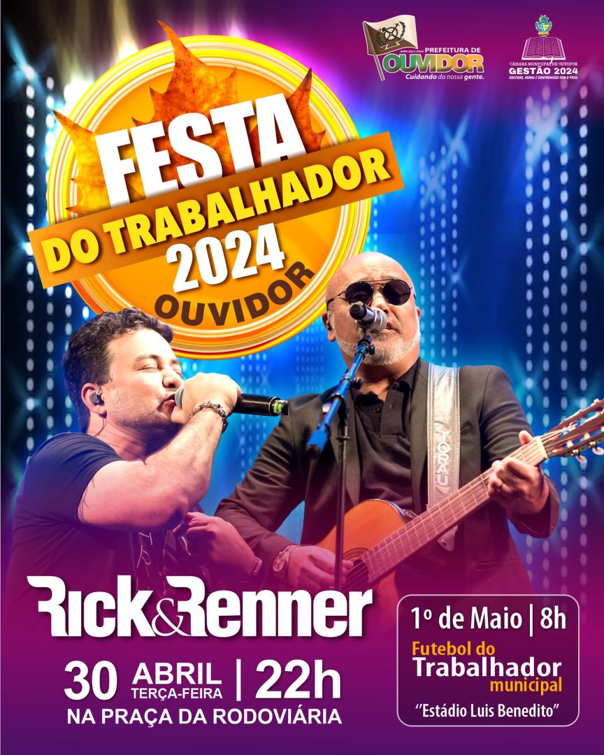 Publicado em: 17/04/2024 Festa do Trabalhador 2024 – Confirmado!! Grande show com Rick & Renner no dia 30 de abril, a partir das 22h, na Praça da Rodoviária em Ouvidor.